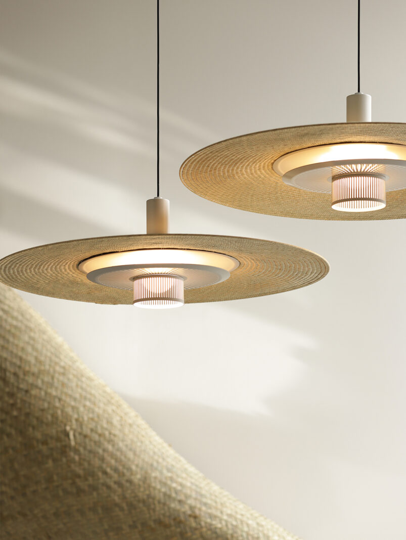 Palma beige pendant light by david pompa brings together a handwoven palma shade with a sophisticated chrome, coated metal piece in ochre or white. The contrast between a striking metal texture marked by fine openings and the soft weaving surface creates an intriguing interplay between industrial production and craft techniques. The subtle tone of the beige palma matches perfectly any warm space. The 3 different finishes allow a more personalized piece, suiting distinct scenarios. Discover LES VRAIS design distirbution newest pieces: studio david Pompa’s Trufa White, Meta Parallel White and a limited edition of the iconic Meta in aluminum.
